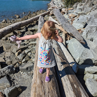 Moi je reste sur la plage avec les filles pendant ce temps. Elles mettent les pieds dans l'eau et jouent sur le sable mais ne se baignent pas car l'eau est froide. En après-midi on va à Tofino.