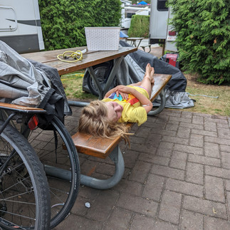 On rejoint ensuite notre camping à Tofino. Il est très bien situé proche de la mer et on est branché eau, électricité et égouts. Par contre il est un peu cher et n'a pas de module de jeux pour enfants ni d'emplacements de tente. On est content car on peut prendre une douche, ça fait plusieurs jours que nous sommes en itinérance et avec les problèmes de cuve, on m'avait que très peu accès à l'eau...