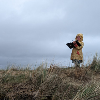 Je vais à la plage de Saint-Anne avec les filles et mon grand-père. C'est dans ces dunes que l'on jouait au jeu de la gamelle quand on était jeunes avec mes cousins et mon grands-père. Le veil arbre est encore là au milieu des dunes de sable mais il y a des grosses flaques d'eau qui se sont formées au travers et on ne circule plus comme avant... Les filles courent dans les dunes. Eno a son cahier et dessine.